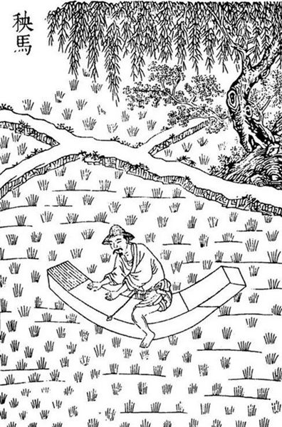 北宋紹圣元年(1094年),蘇軾被謫惠州,途經江西廬陵(今吉安),退休的“宣德郎”曾安止向他出示所作《禾譜》,蘇軾認為他的文章寫得很好,記錄也很翔實,可惜沒把農具記載進去。他往年游武昌時,見農夫皆騎秧馬,這種秧馬,“以榆棗為腹欲其滑,以楸桐為背欲其輕,腹如小舟,昂其首尾,背如覆瓦,以便兩髀,雀躍于泥中,系束藁其首以縛秧”,形如小船,前后翹起,在水田插秧時,跨坐其上,腳蹬滑行,可以“日行千畦”,比彎腰弓背勞作省力得多,而且還可以避免農人的腿因長時間泡在水里生瘡潰爛。