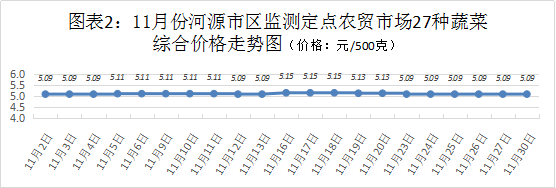 27個蔬菜品種月均綜合價格5.11元,環比微漲0.39%。月內蔬菜綜合價格運行較為平穩(圖表2)。其中:西紅柿5.5元、萵筍5.5元、茄子4.76元、青尖椒5.93元、苦瓜5.26元,環比分別漲4.76%、4.76%、5.78%、5.2%、18.6%。
