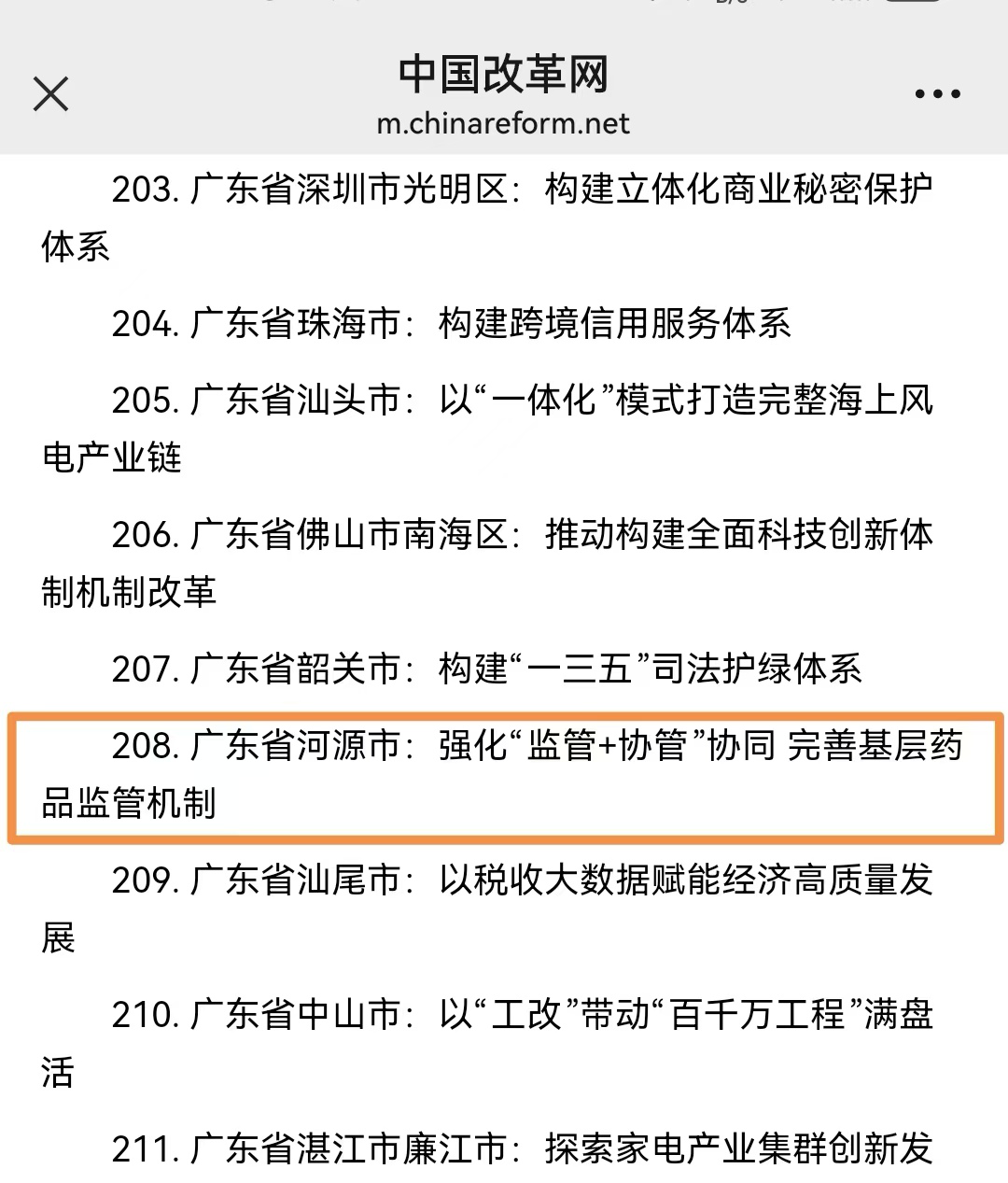 12月18日,由國家發改委主管、中國經濟體制改革研究會主辦的中國經濟體制改革雜志社發布中國改革2024年度地方全面深化改革案例名單(共300個),我市“強化‘監管+協管’協同完善基層藥品監管機制”改革案例成功入選,是廣東省唯一在藥品監管領域綜合改革項目中獲得典型案例的地級市。