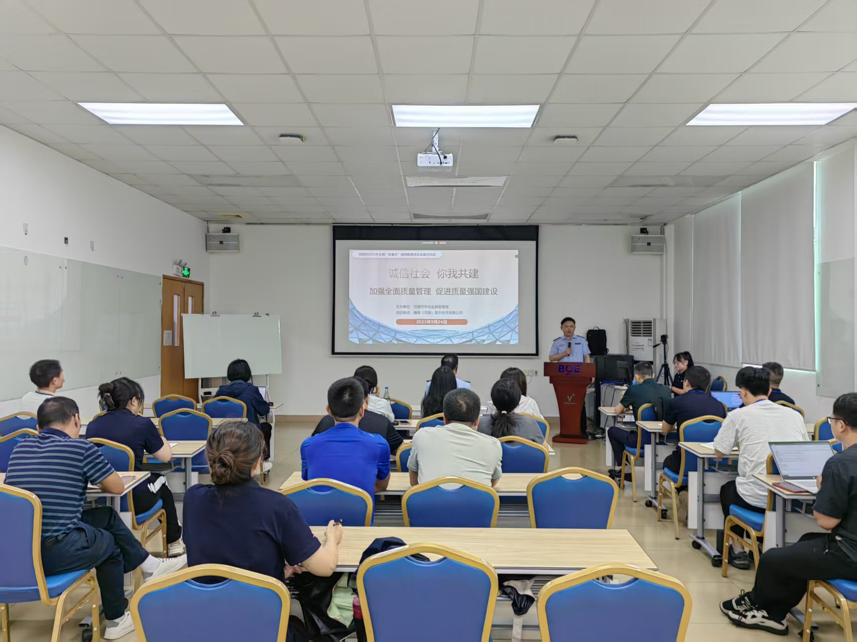 9月24日,河源市市場監督管理局在精電(河源)顯示技術有限公司開展2025年全國“質量月”誠信宣傳進企業宣講活動。本次活動圍繞“加強全面質量管理促進質量強國建設”主題,以我市信息產品制造企業為切入點,開展送質量服務和信用服務入企活動,為我市加快打造千億級電子信息產業提供質量支撐。