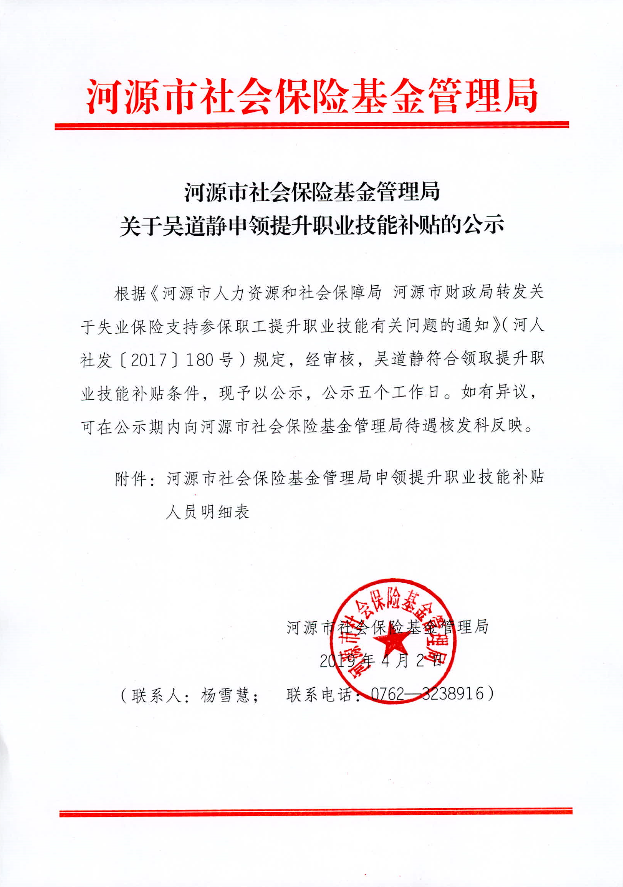 河源市社會保險基金管理局關于吳道靜申領提升職業技能補貼的公示