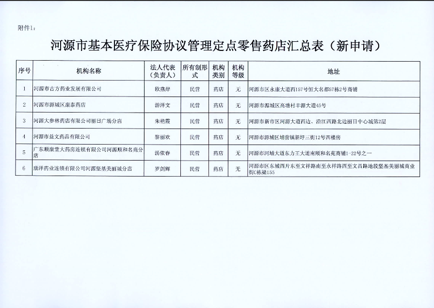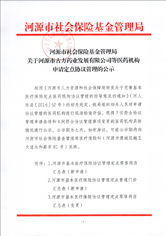 河源市社會保險基金管理局關于河源市古方藥業發展有限公司等醫藥機構申請定點協議管理的公示