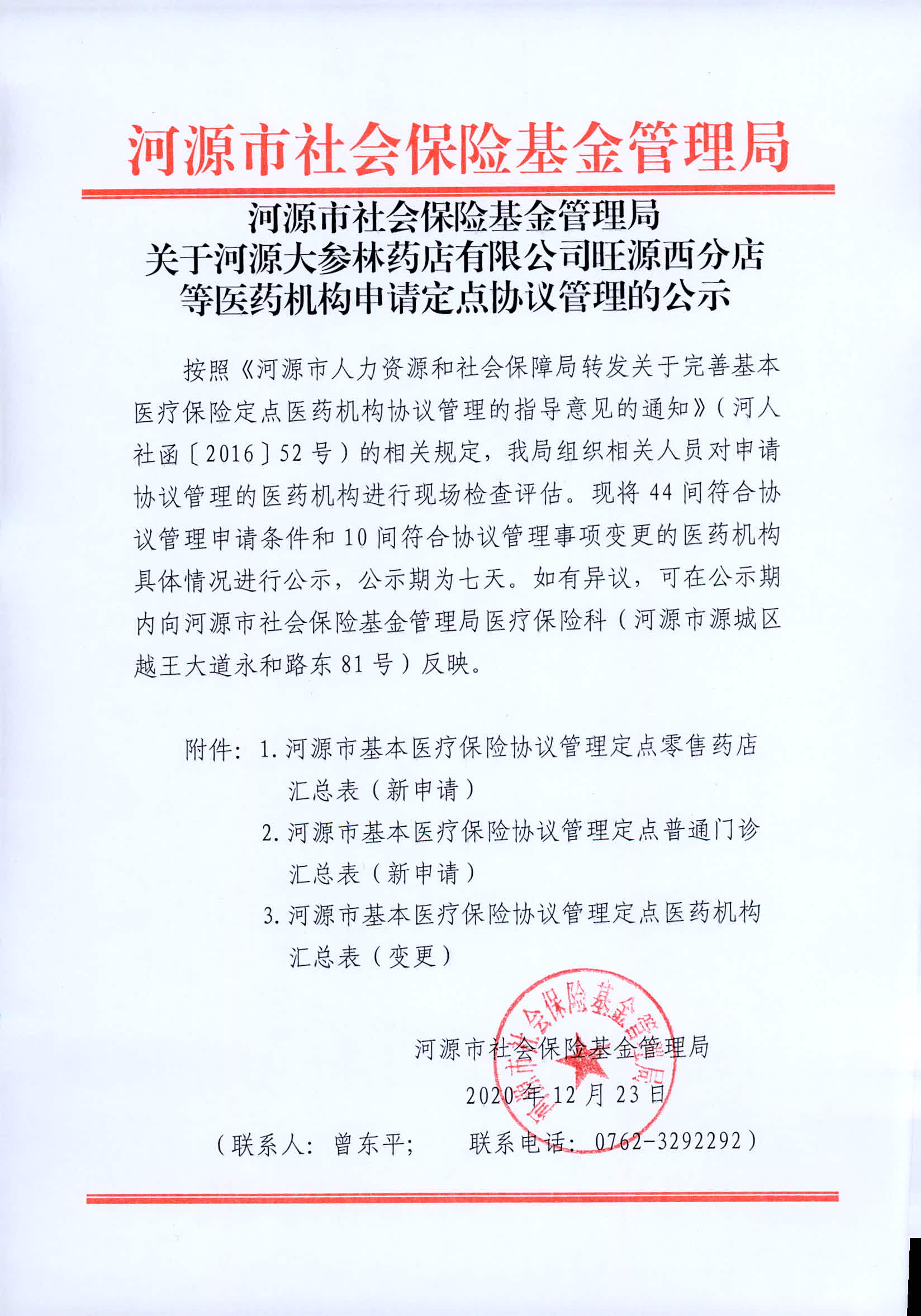 河源市社會保險基金管理局關于河源大參林藥店有限公司旺源西分店等醫藥機構申請定點協議管理的公示