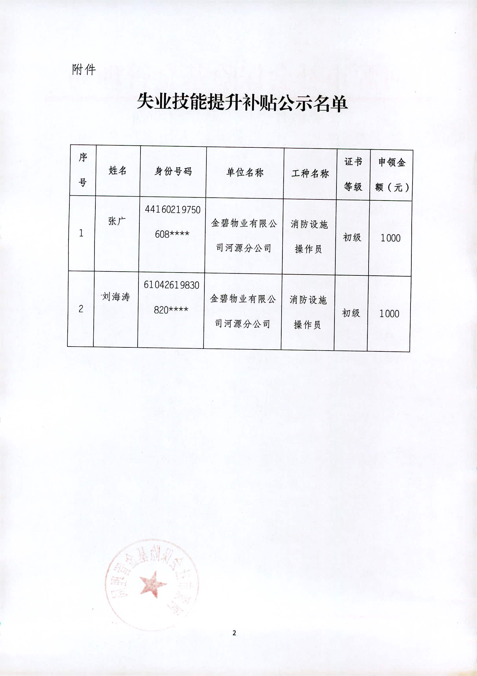 河源市社會保險基金管理局關于發放失業技能提升補貼人員名單公示的通知