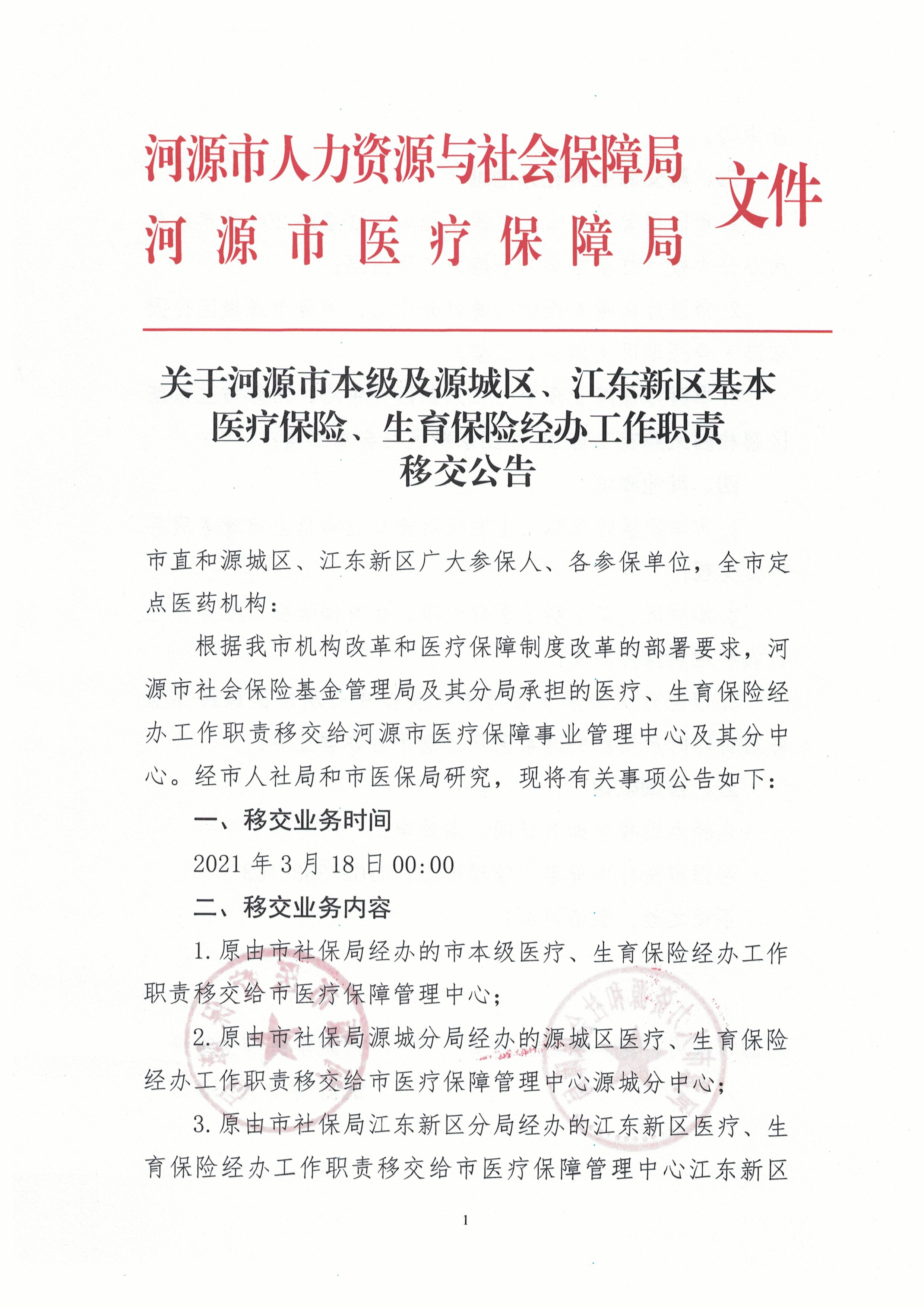 關于河源市本級及源城區、江東新區基本醫療保險、生育保險經辦工作職責移交公告