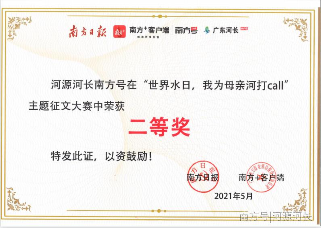 為進(jìn)一步加強(qiáng)節(jié)水、護(hù)河宣傳,市河長(zhǎng)辦積極組織發(fā)動(dòng)各縣區(qū)河長(zhǎng)辦參加了征文大賽,其中河源河長(zhǎng)南方號(hào)推送的作品《節(jié)水護(hù)水河源民間河長(zhǎng)在行動(dòng)》獲得了“廣東河長(zhǎng)南方號(hào)”組第二名。