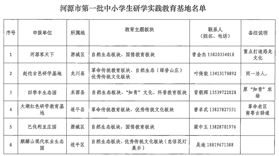近日,河源市第一批中小學研學實踐教育基地名單新鮮出爐啦!其中,河源客天下、趙佗古邑研學基地、四季豐生態園、大湖紅色研學教育基地、巴伐利亞莊園、麒麟山現代農業生態園6家教育基地入選。