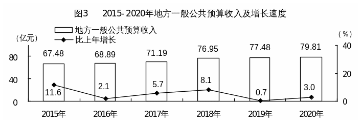 全年全市地方一般公共預(yù)算收入79.81億元,比上年增長3.0%。其中,稅收收入49.35億元,下降2.4%。全年一般公共預(yù)算支出361.76億元,下降2.3%。其中,住房保障支出8.85億元,增長205.8%;交通運輸支出14.09億元,增長98.2%;農(nóng)林水支出45.41億元,增長34.9%;教育支出73.58億元,增長3.2%。民生類支出283.32億元,占一般公共預(yù)算支出近八成。