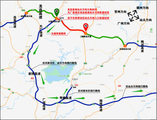 (一)11月12日8時至11月26日24時G78龍連高速公路金花隧道汕頭方向K287+856-K283+109路段封閉;封閉龍連高速公路往汕頭方向元善樞紐互通(K294+805)主線,封閉元善樞紐互通大廣高速往廣州及贛州方向轉龍連高速汕頭方向匝道和封閉龍連高速公路連平東收費站往汕頭方向入口匝道。封閉期間,龍連高速公路往汕頭方向車輛從元善樞紐互通出口分流駛出,繞行大廣高速、新博高速、廣河高速、揭博高速等。