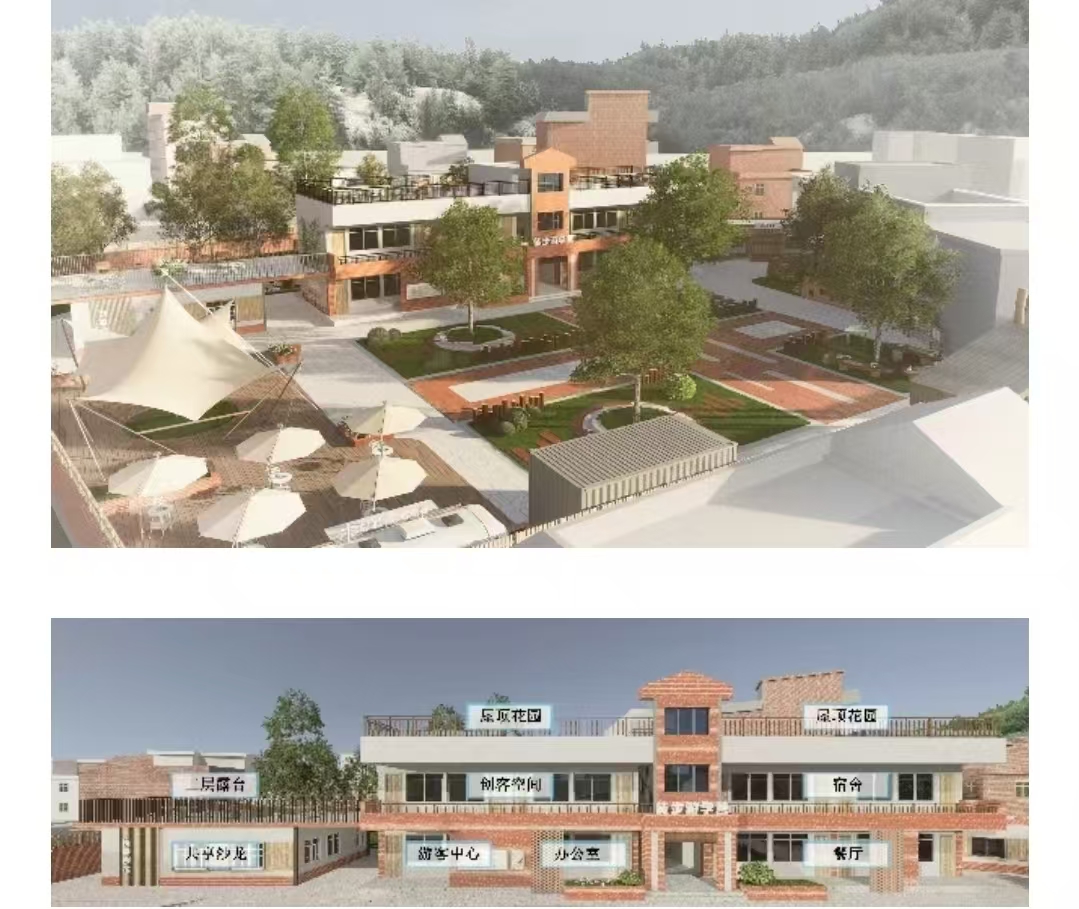 團隊深入留洞村廢棄小學,對3100㎡建筑展開精細測繪與空間分析,基于實地量房數據提出“森林徒步游學營”改造方案。一層以客家飲食文化為核心,改造為研學餐廳與集路線咨詢、裝備補給功能于一體的游客中心;二層創新采用竹編透光隔斷劃分宿舍區,并將原教室轉型為自然手作工坊;屋頂增設觀星平臺與交流區,延伸自然教育場景。設計保留磚瓦肌理,融入共享沙龍、戶外營地等新功能,實現廢棄空間向多功能研學綜合體的蛻變。