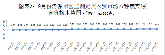 27個(gè)蔬菜品種月均綜合價(jià)格5.05元,環(huán)比漲2.23%。主要原因是值季節(jié)交替、當(dāng)季蔬菜產(chǎn)量減少。月內(nèi)蔬菜綜合價(jià)格呈小幅上行走勢(shì)(圖表2)。本地菜心6元、上海青4.91元、生菜5.29元、菠菜6.8元、土豆4.29元,環(huán)比分別漲4.53%、12.87%、4.13%、5.92%、1.42%。