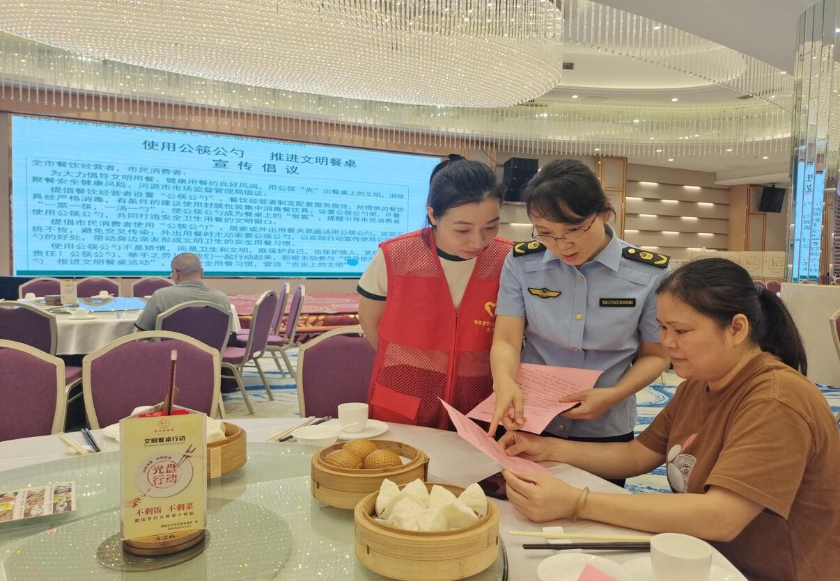活動中,市場監管部門工作人員指導酒店在餐廳入口處和餐桌等醒目位置擺放“文明用餐”、“公筷公勺”等提示牌,督促其配備標識清晰的公筷公勺,增強公筷公勺辨識度,盡量“一菜一筷,一湯一勺”,引導提醒消費者正確使用,在餐廳服務過程中堅持點餐、就餐、餐后三引導,提醒顧客適量點餐、使用公筷公勺、文明就餐。同時向在場就餐的市民消費者宣講發放《河源市倡導使用公筷公勺推進文明餐桌宣傳倡議書》,以“PPT演示”方式滾動播放公筷公勺的定義、使用公筷公勺的好處等內容,引導提倡市民消費者外出用餐時主動索要公筷公勺,夾菜盛湯使用“公筷公勺”,取菜不挑不撿,避免交叉傳染,以實際行動宣傳使用公筷公勺的好處,帶動身邊親友形成文明衛生的安全用餐習慣,用公筷“夾”出餐桌上的文明,消除聚餐食品安全健康風險。