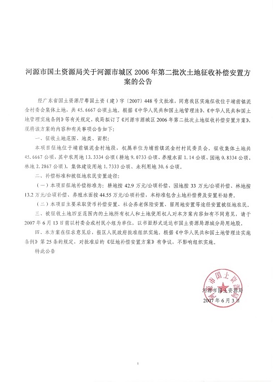 河源市國土資源局關于河源市城區2006年第二批次土地征收補償安置方案的公告