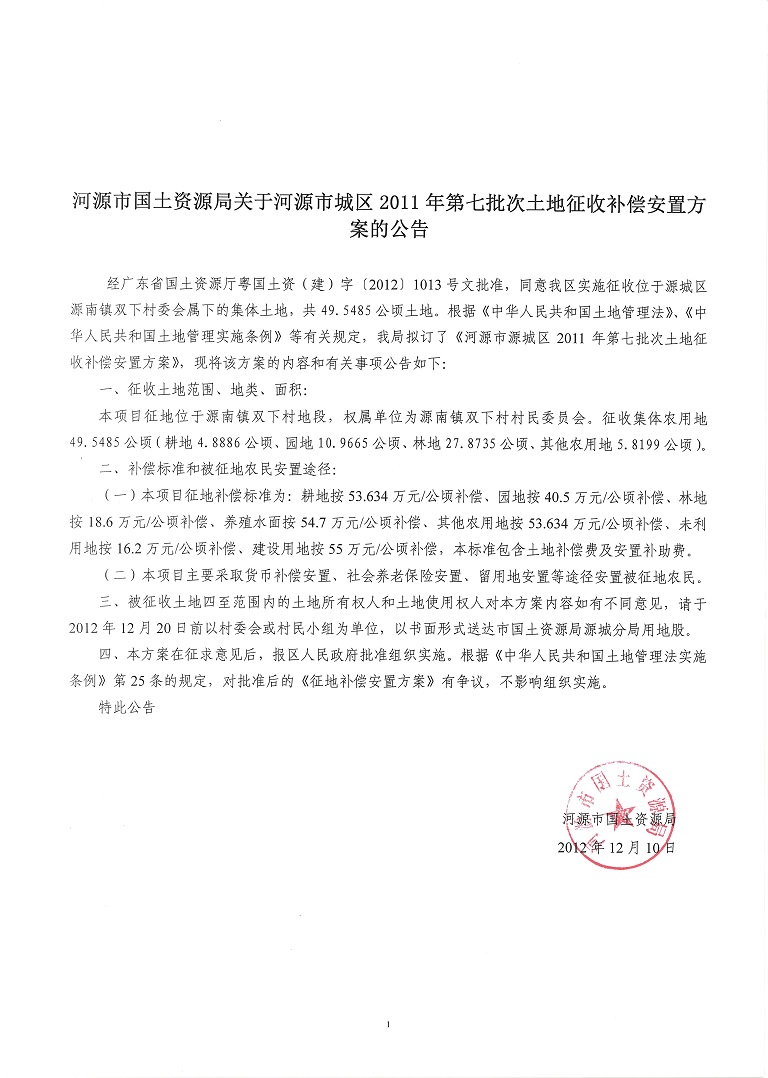 河源市國土資源局關于河源市城區2011年第七批次土地征收補償安置方案的公告