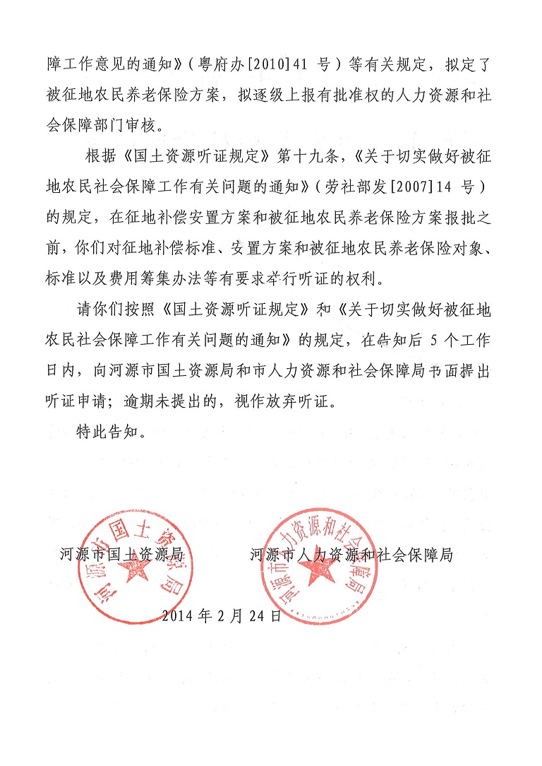 河源市城區2014年度第四批次城鎮建設用地聽證告知書